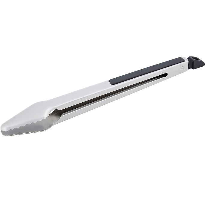 De gepatenteerde éénhandsvergrendeling maakt het gebruik extra comfortabel: met een simpele kantelbeweging open of sluit je de tang, zodat je altijd één hand vrijhoudt voor een spatel, schaal of thermometer. De tandvormige uiteinden grijpen vlees, vis en groenten stevig vast zonder ze te beschadigen — precies wat je wilt tijdens het grillen.