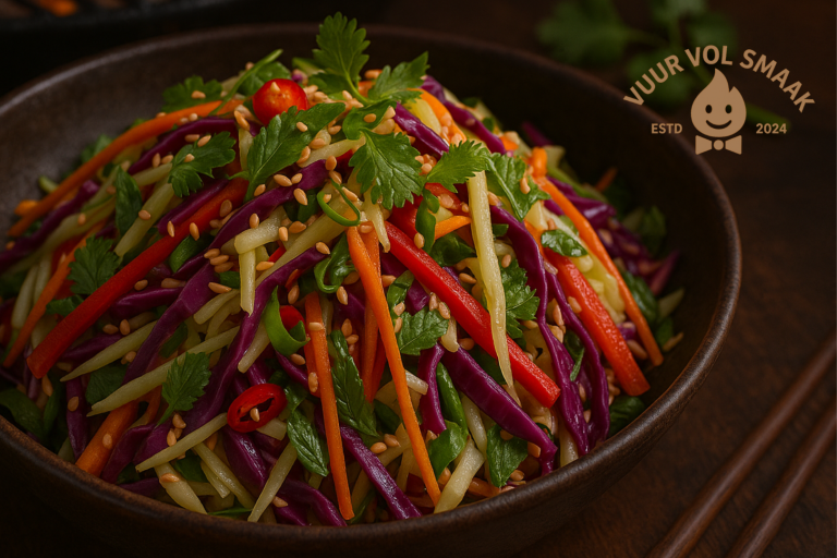 Knapperige koolsoorten, wortel en paprika, verrijkt met een lichte sesam-limoendressing en frisse kruiden. Deze Aziatisch geïnspireerde slaw brengt balans en frisheid naast rijke BBQ-smaken. Een verfijnd bijgerecht dat elegantie toevoegt aan elke barbecue of diner.
