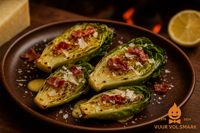 Gegrilde Little Gem van de BBQ, romige citroen-Parmezaandressing, knapperige pancetta en delicate Parmezaanflakes. Een luxe bijgerecht dat frisheid combineert met rijke smaken en perfect past bij elke BBQ of verfijnd diner.