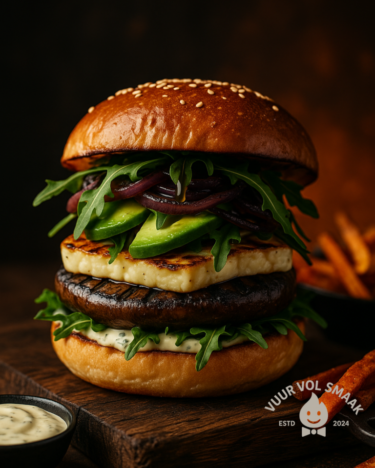 Een burger hoeft geen vlees te zijn om luxe en karakter te hebben. Deze Portobello Burger met halloumi, jalapeño mayo en een vleugje truffelolie combineert rokerige diepte, romige pit en een subtiele luxe toets in één gerecht. Perfect als vegetarisch hoogtepunt op de BBQ en volledig in lijn met de Vuurvolsmaak-stijl: premium, smaakvol en toch eenvoudig.